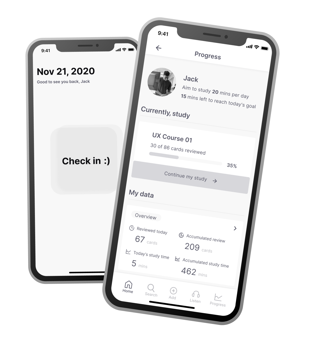 Showing users their current progress, provide days and time users spent on learning (both consecutive and accumulated days/time).