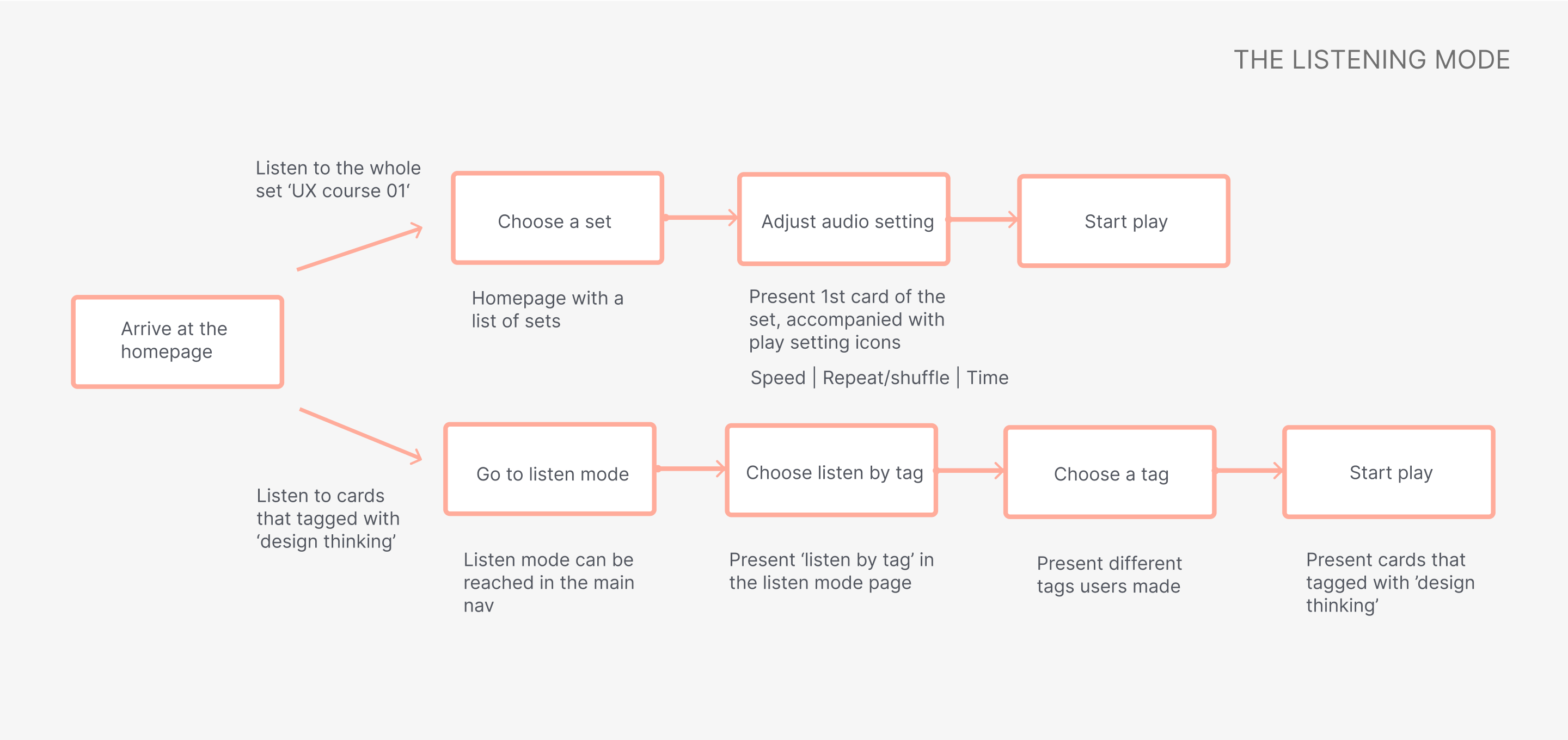 Users can either access the audio mode from a specific card, or they can go to the bottom navigation to explore more listening options. For example, they can choose to listen to all the cards with the same tag from the listen screen.