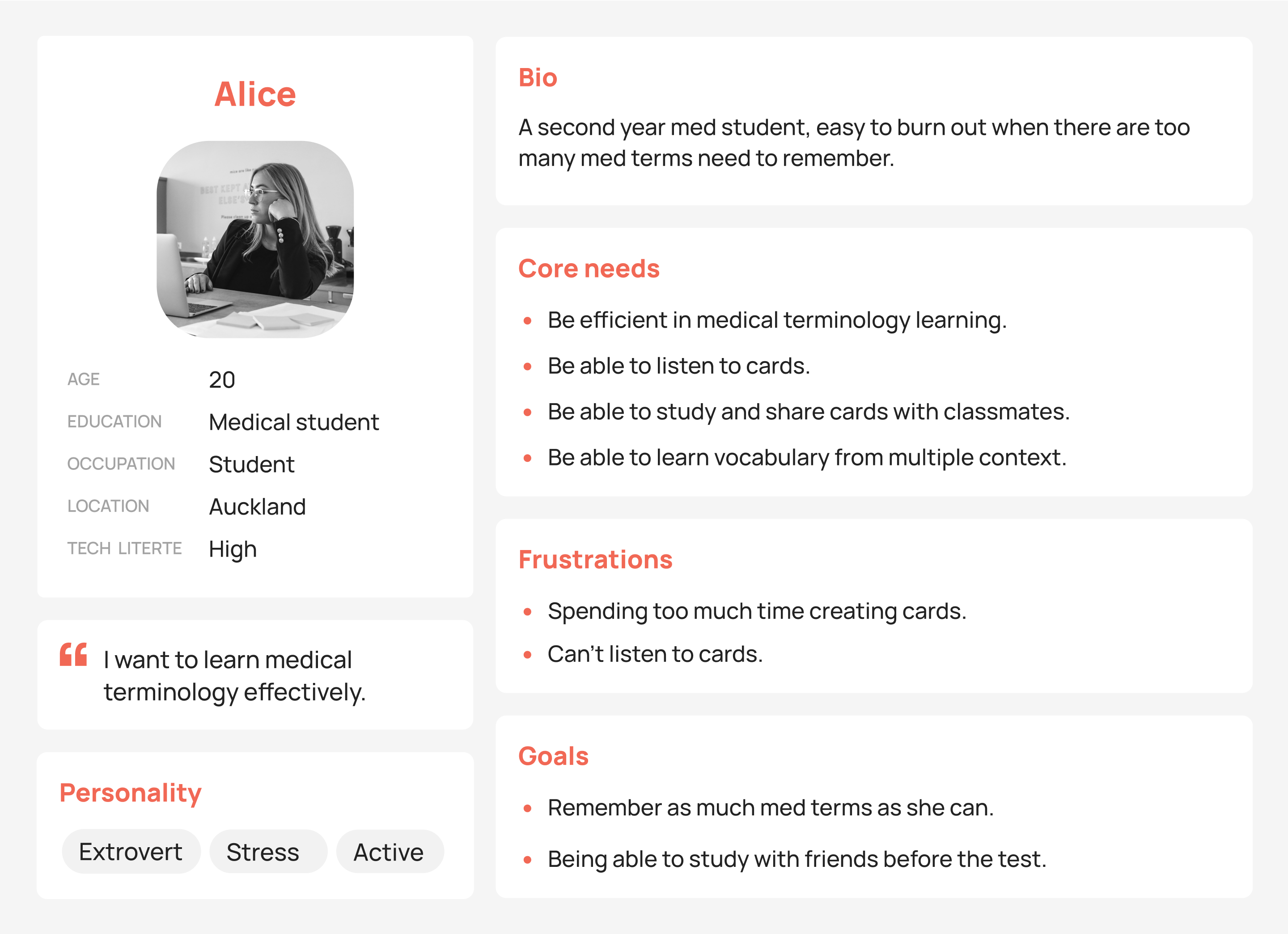 From user interviews, I find that there are 2 types users with different goals and needs, 1 is the student group, who want to maximize the efficiency of learning, the other is the working group, who need more of the motivation boost. Below you can find 2 personas created from the findings.